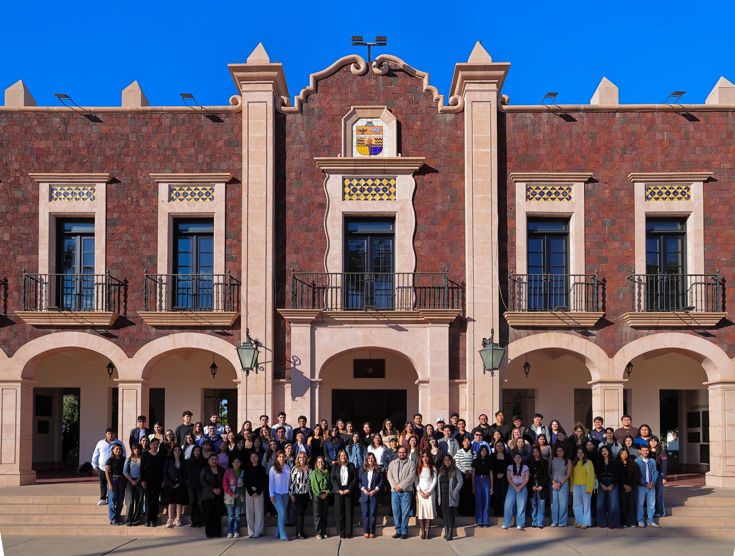 Junto al equipo de la Dirección de Apoyo a Estudiantes, a cargo de Jessica Yvette Coronado Verdugo, la rectora acompañó al grupo de estudiantes para la toma de la fotografía oficial en el frontispicio del edificio principal de la universidad.