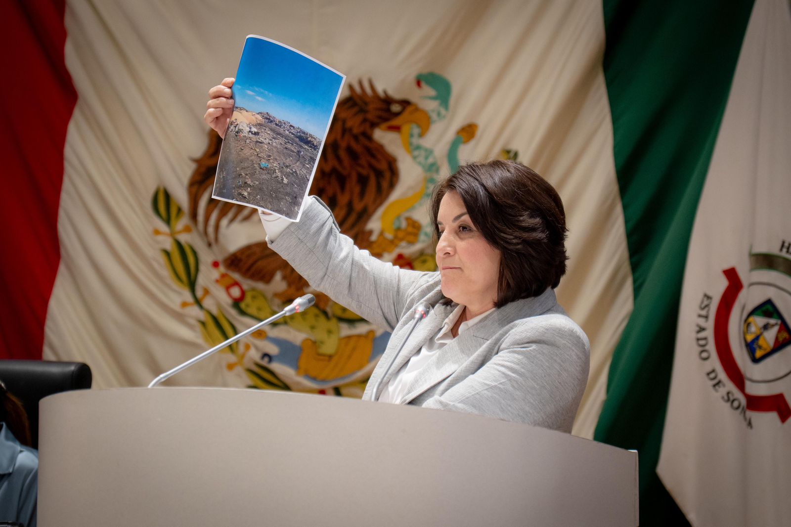 La diputada también llamó la atención sobre el caso del relleno sanitario de Puerto Peñasco, incluido dentro de un nuevo endeudamiento estatal. Denunció que se pretende financiar una “segunda etapa” de la obra cuando la primera ni siquiera existe y que el predio señalado para su construcción ha sido reclamado públicamente por una particular como propiedad privada. “No hay proyecto ejecutivo, no hay primera etapa y no hay certeza sobre el terreno”, cuestionó.