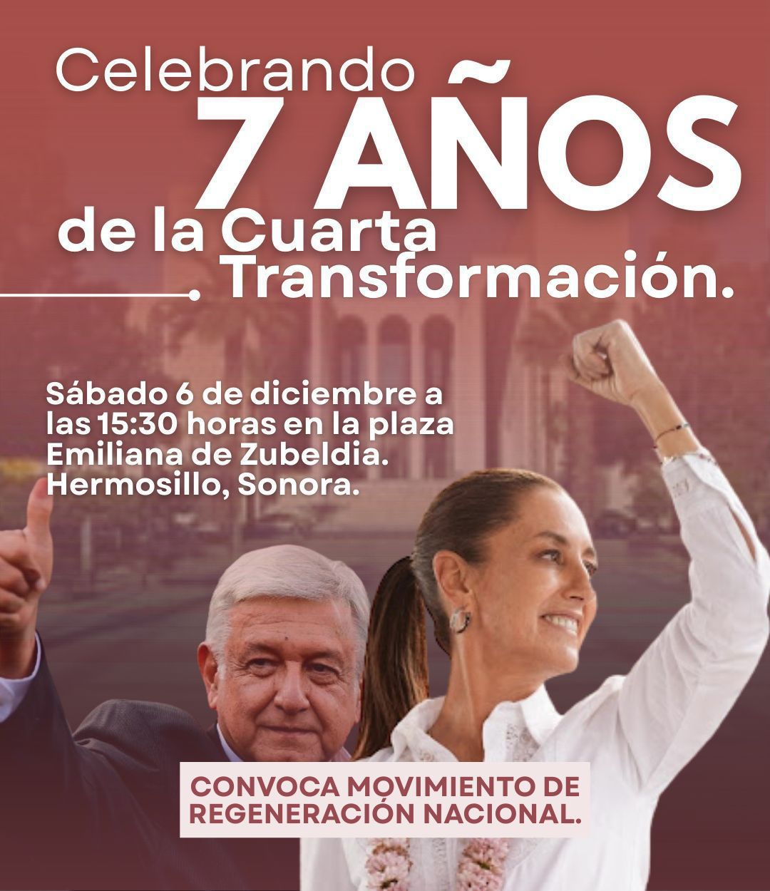 Hermosillo, Sonora, diciembre de 2025. —El Movimiento de Regeneración Nacional en Sonora convoca a la población de Hermosillo a participar en la concentración “Celebrando 7 años de la Cuarta Transformación”, que se llevará a cabo el sábado 6 de diciembre a las 15:30 horas en la Plaza Emiliana de Zubeldía, en el centro de la ciudad.