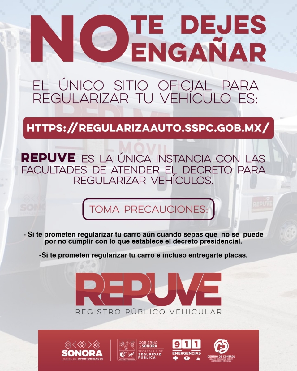 Hermosillo, Sonora; 5 de diciembre de 2025.- Para prevenir que las y los ciudadanos interesados en la regularización de vehículos usados de procedencia extranjera sean víctimas de estafas, la Secretaría de Seguridad Pública (SSP) de Sonora reiteró que, el trámite se realiza únicamente en el sitio web https://regularizaauto.sspc.gob.mx.