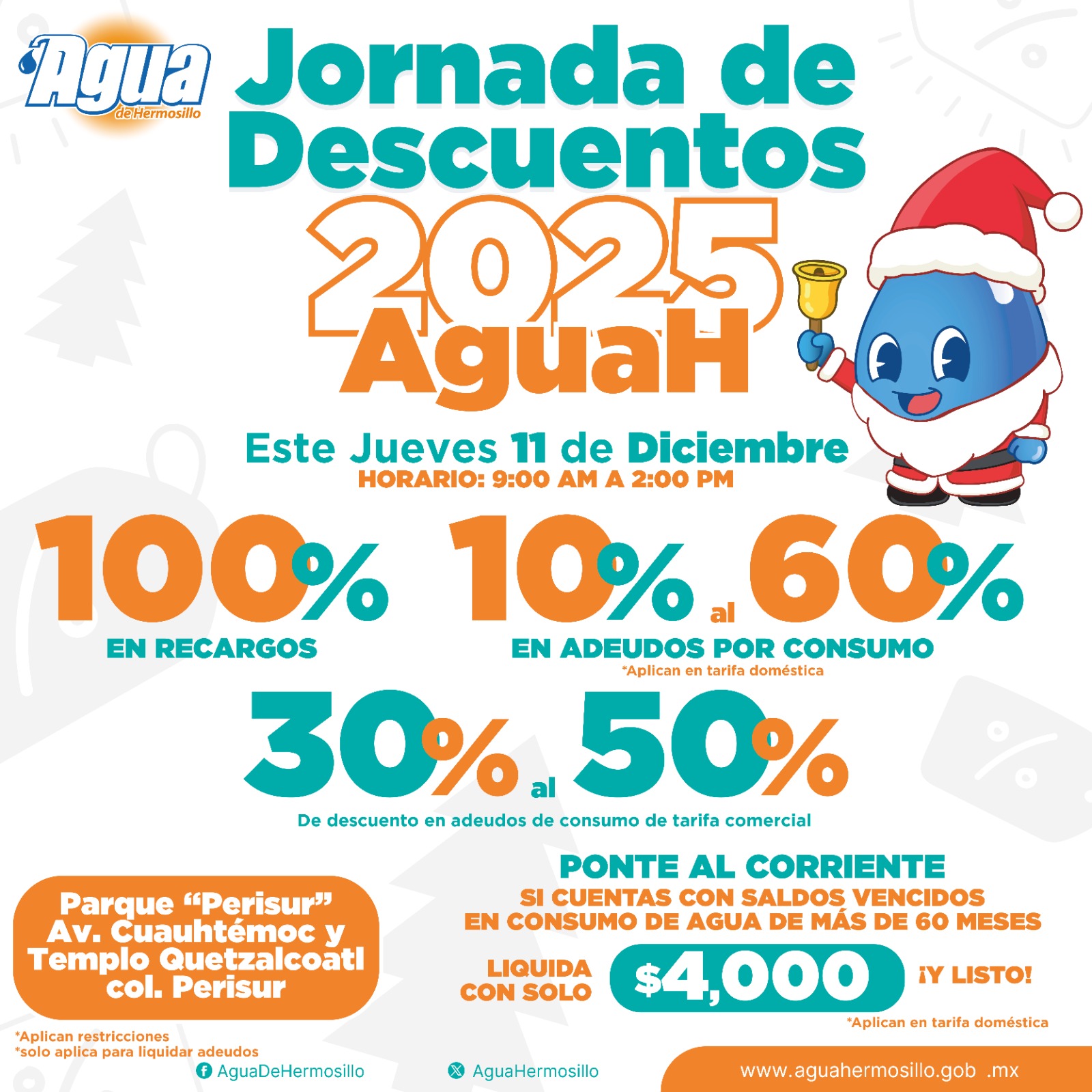 Hermosillo, Sonora; 9 de diciembre, 2025.-Una invitación a las y los usuarios de Agua de Hermosillo a aprovechar la Jornada de Descuentos este jueves 11 de diciembre en el parque de la colonia Perisur realizó el organismo operador.