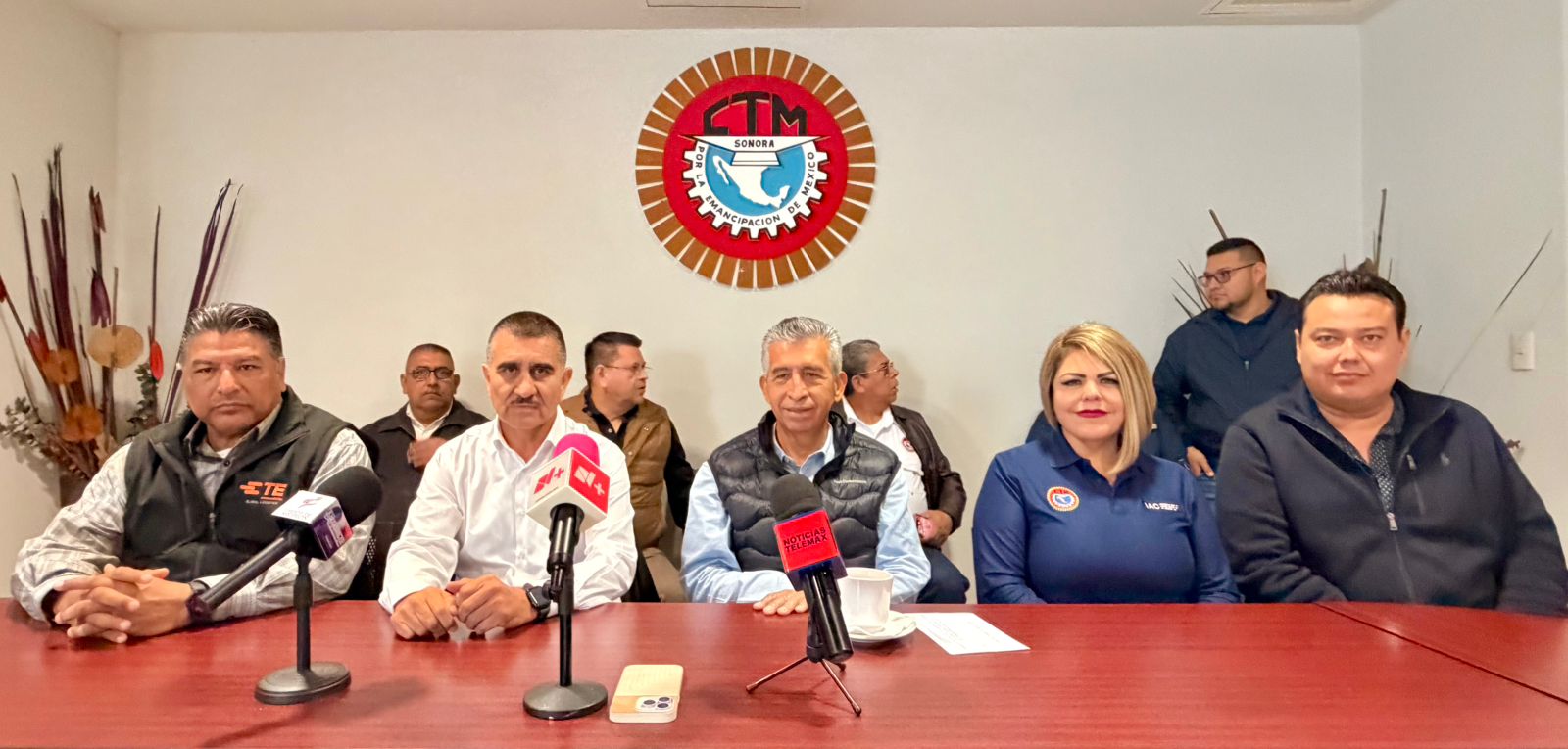 Hermosillo, Sonora, 10 de diciembre de 2025.- La federación de trabajadores del estado de Sonora, CTM, en rueda de prensa encabezada por el dirigente estatal Javier Villarreal Gamez y el diputado local cetemista Oscar Ortiz Arvayo, así como dirigentes sindicales, presentaron los principales acuerdos derivados de la Asamblea Estatal Plenaria realizada el 27 y 28 de noviembre, así como los posicionamientos respecto a la reforma de la jornada laboral y el incremento al salario mínimo.