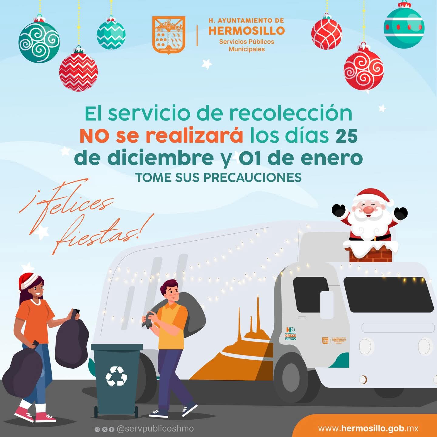 Hermosillo, Sonora; 22 de diciembre, 2025.- Como cada año, los días jueves 25 de diciembre y 1 de enero de 2026 se suspenderá el servicio de recolección de basura en los domicilios, informó Sergio Pavlovich Escalante, director de Servicios Públicos Municipales.