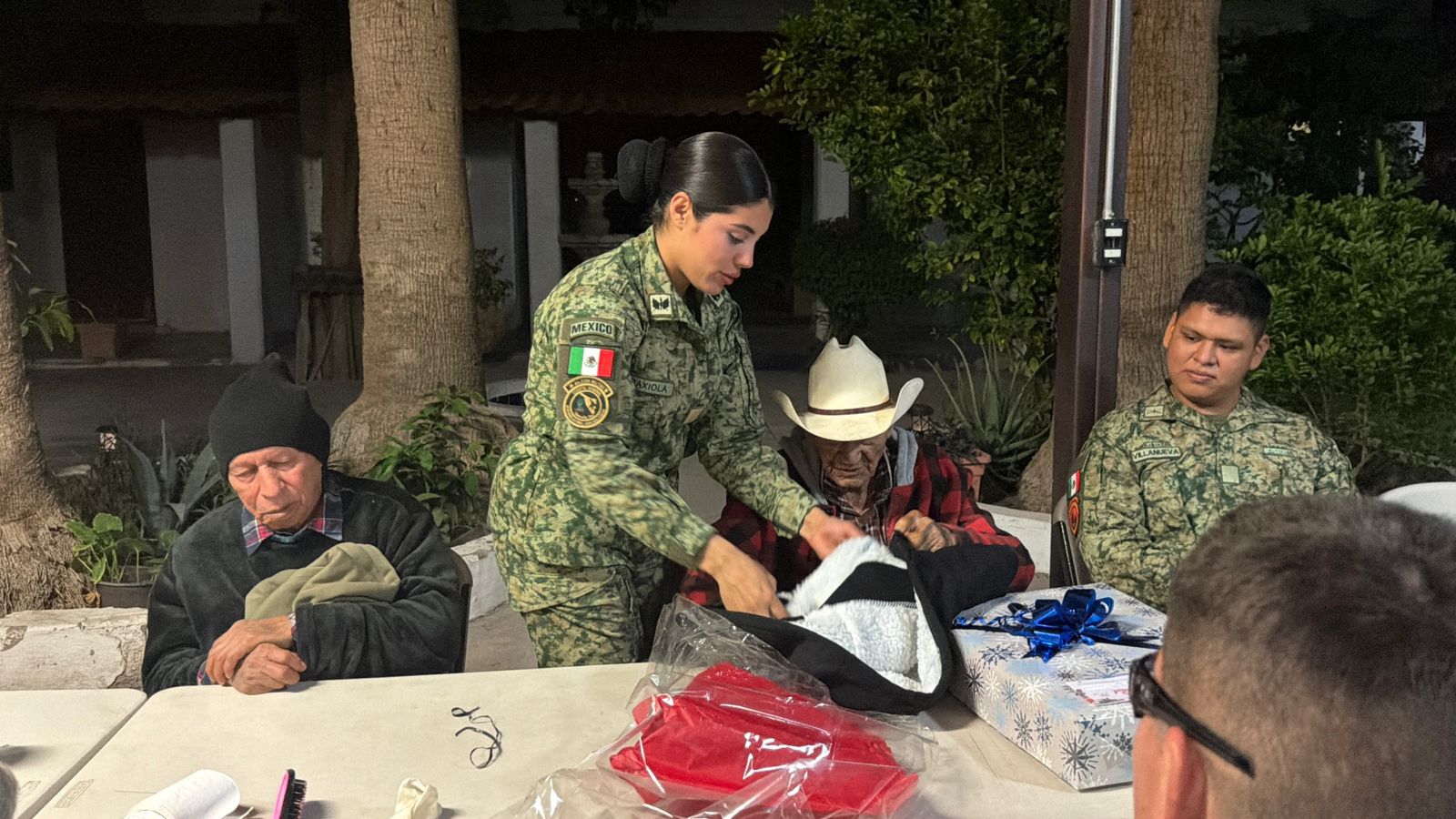 Durante la actividad, el personal militar llevó la cena de Noche Buena y entregó obsequios a los huéspedes del asilo, con el objetivo de brindarles un momento de alegría, compañía y calidez en una fecha significativa para las familias mexicanas.