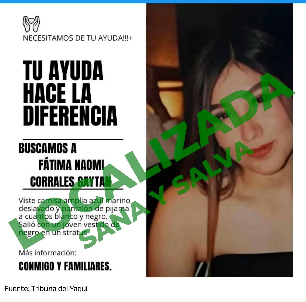 Empalme, Sonora, 31 de diciembre de 2025.- La Fiscalía General de Justicia del Estado de Sonora informa que fue localizada con vida Fátima Naomi “N” de 20 años de edad, previamente reportada como desaparecida, en hechos ocurridos este martes 30 de diciembre.