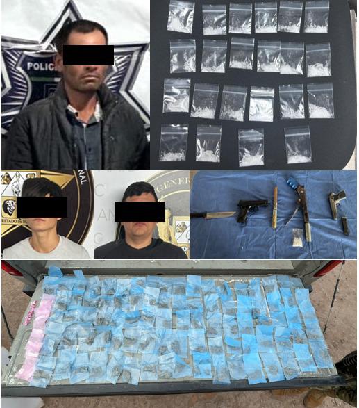 Asimismo, en el municipio de Hermosillo, durante recorridos preventivos en la colonia El Mariachi, elementos de la Policía Estatal detuvieron a Geovanny “N”, de 30 años, y José “N”, de 18 años. En el lugar se aseguró un arma de fuego corta tipo pistola calibre .380 mm, un arma hechiza tipo escopeta calibre 12, un arma blanca y un envoltorio con sustancia similar al cristal, reforzando las acciones preventivas para proteger a la población.