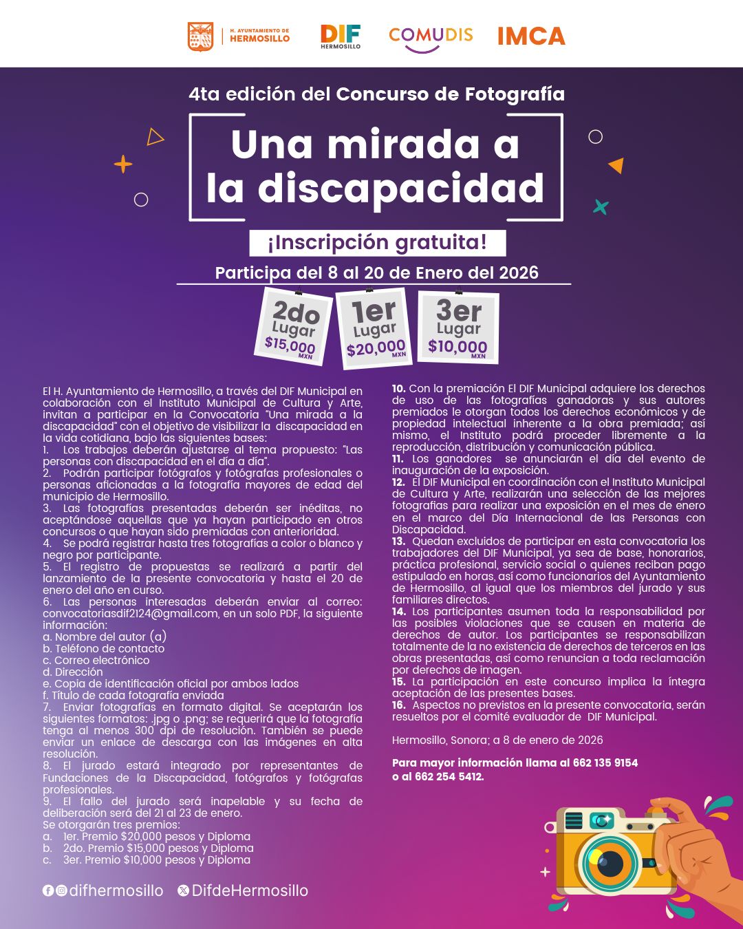 Quienes se interesen en participar en este concurso, sin importar que tengan o no formación profesional en fotografía, pueden consultar o descargar la convocatoria completa desde las redes sociales de DIF Municipal o bien comunicarse a los números telefónicos 6621 35 91 54 y 6622 54 54 12.