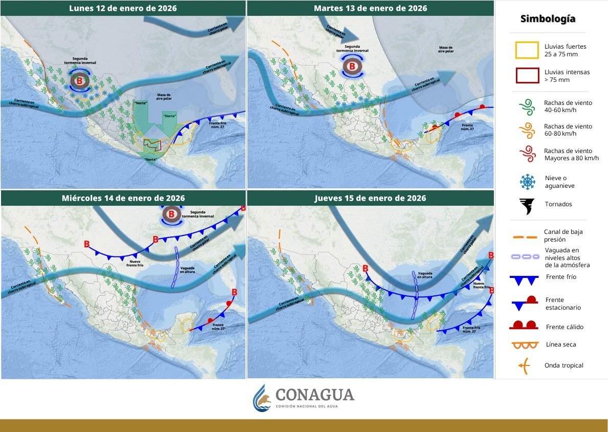 Asimismo, se mantendrá un ambiente muy frío, durante la noche y madrugada, sobre la región montañosa de Sonora. Se esperan temperaturas desde los -5°C a los 4°C, con posibles heladas sobre municipios de dicha región.
