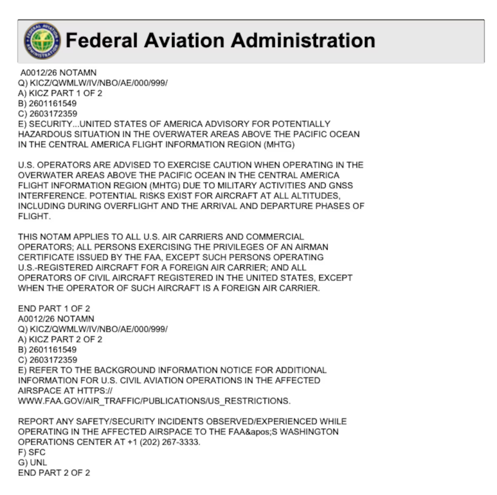 La FAA había emitió este 16 de enerouna serie de advertencias dirigidas a aerolíneas y pilotos para que extremen precauciones al volar sobre México, Panamá, Colombia y Ecuador, así como otras zonas de Centroamérica y partes del espacio aéreo dentro del Océano Pacífico oriental.