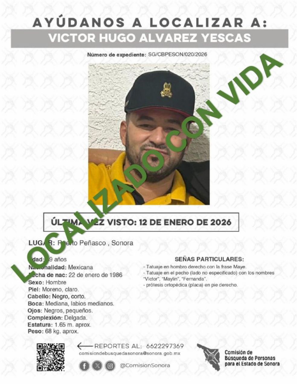 Puerto Peñasco, Sonora; 17 de enero de 2026.- La Fiscalía General de Justicia del Estado de Sonora (FGJES) informa la localización con vida de Víctor Hugo de 39 años, quien había sido reportado como desaparecido desde el pasado 12 de enero.