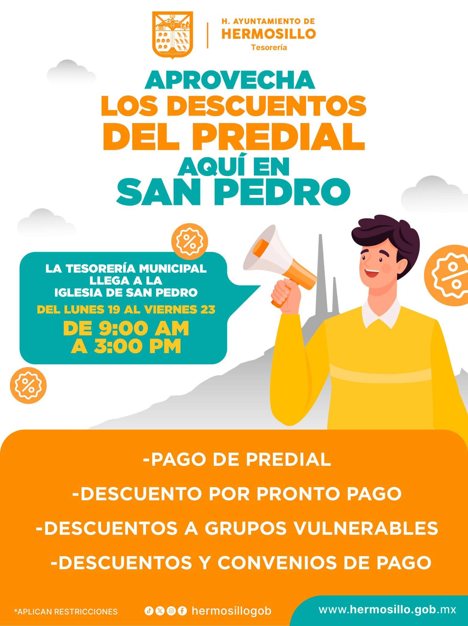 Hermosillo, Sonora; 19 de enero, 2026.- A partir de este lunes 19 de enero y hasta el viernes 23 operará un Centro de Atención de Tesorería Municipal de Hermosillo en la iglesia de San Pedro el Saucito, informó Yazmina Anaya, directora de Ingresos de la dependencia.