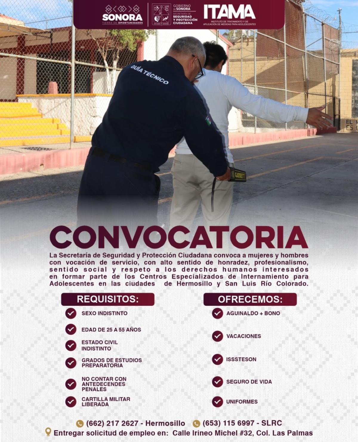 Hermosillo, Sonora; 26 de enero de 2026.– Para reforzar las labores de seguridad al interior de los Centros Especializados de Internamiento en Hermosillo y San Luis Río Colorado, el Instituto de Tratamiento y de Aplicación de Medidas para Adolescentes (ITAMA) anunció su convocatoria para Guías Técnicos.