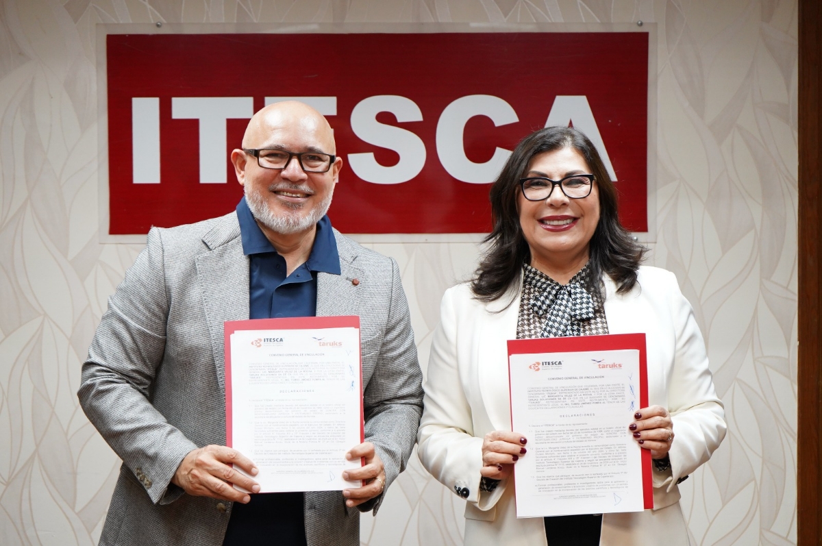 Margarita Vélez de la Rocha, directora general del Itesca, y Tomás Jiménez, director general de Taruks Soluciones, firmaron dicho convenio para impulsar la formación de profesionales altamente capacitados, fortaleciendo la relación entre la academia y los distintos sectores de nuestra sociedad.