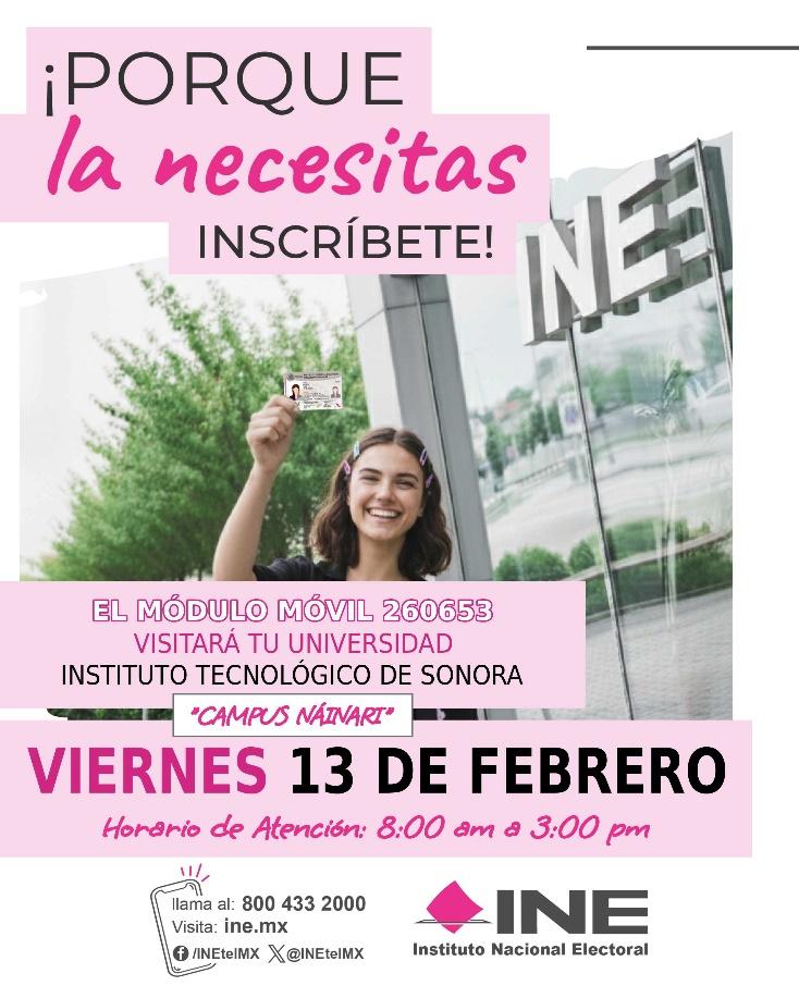 En busca de promover la inscripción al padrón electoral, la actualización de datos y renovación de credenciales de elector, los días 30 de enero y 27 de febrero de 2026, el módulo móvil estará instalado dentro de las instalaciones del ITSON Campus Centro, en un horario de 8:00 a 15:00 horas.