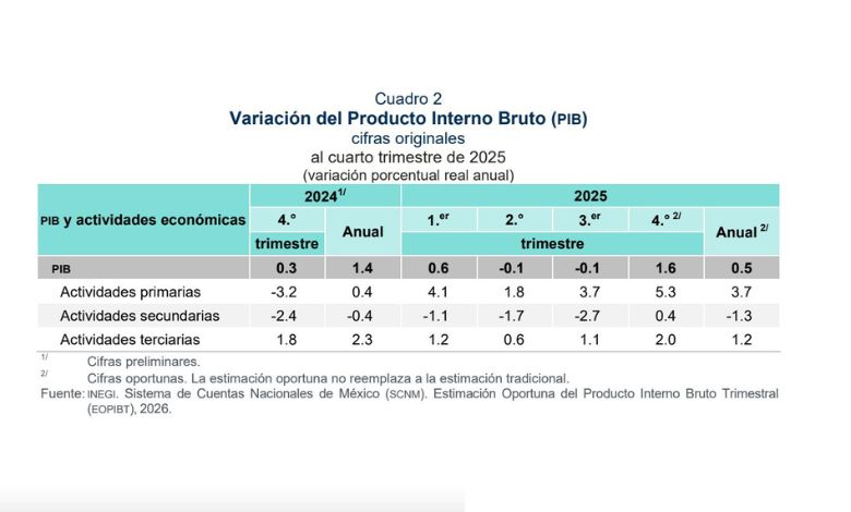 La economía mexicana cerró el ejercicio 2025 con señales mixtas de recuperación. Según la Estimación Oportuna del Producto Interno Bruto (Eopbit) del Inegi, el PIB registró una aceleración del 1.6 % en el cuarto trimestre del año, su nivel más alto en los últimos siete trimestres. A pesar de este repunte, el balance anual total de 2025 se situó en un modesto 0.5%, una desaceleración significativa frente al 1.4% reportado al cierre de 2024.