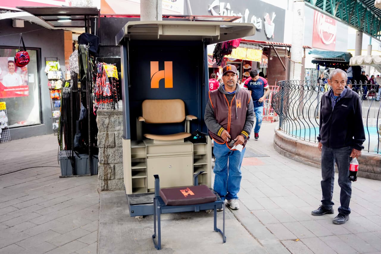 Hermosillo, Sonora; 14 de febrero, 2026.-Quienes viven del oficio de aseo de zapatos en el bulevar Hidalgo y Mercado Municipal, recibieron de parte del presidente municipal Antonio Astiazarán una estación de trabajo digna y funcional, así como equipamiento que los distingue como Boleros de la H.