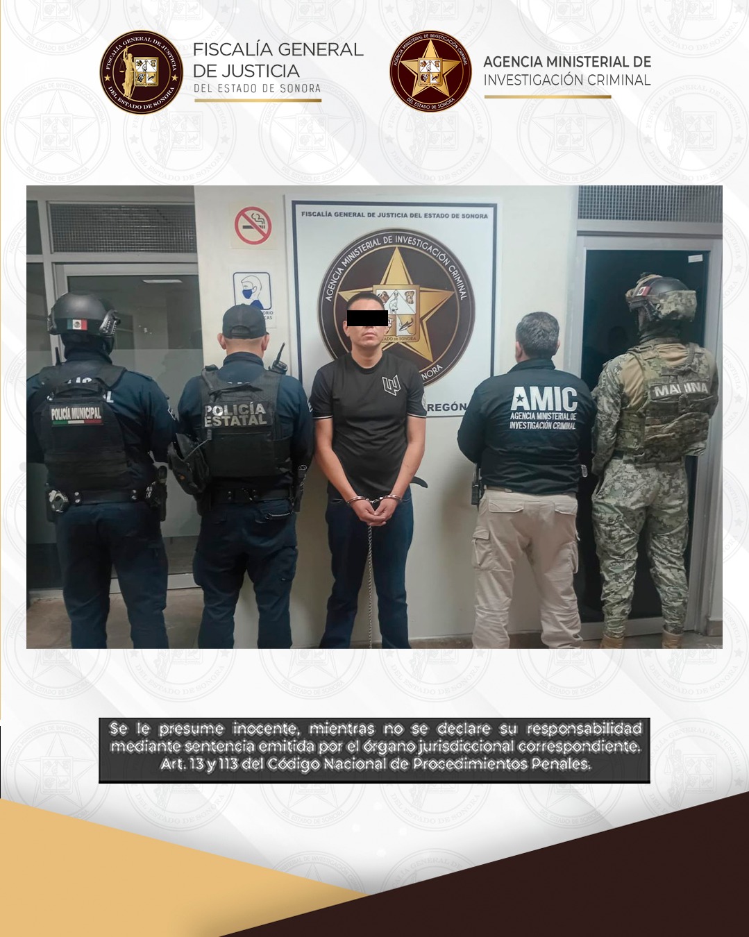 Cajeme, Sonora, 18 de febrero de 2026.- La Fiscalía General de Justicia del Estado de Sonora (FGJES) obtuvo la formulación de imputación, vinculación a proceso y la imposición de prisión preventiva justificada en contra de Gustavo Eduardo “N”, de 27 años, por su probable responsabilidad en el delito de homicidio calificado por premeditación, alevosía y ventaja, en Ciudad Obregón, Sonora.