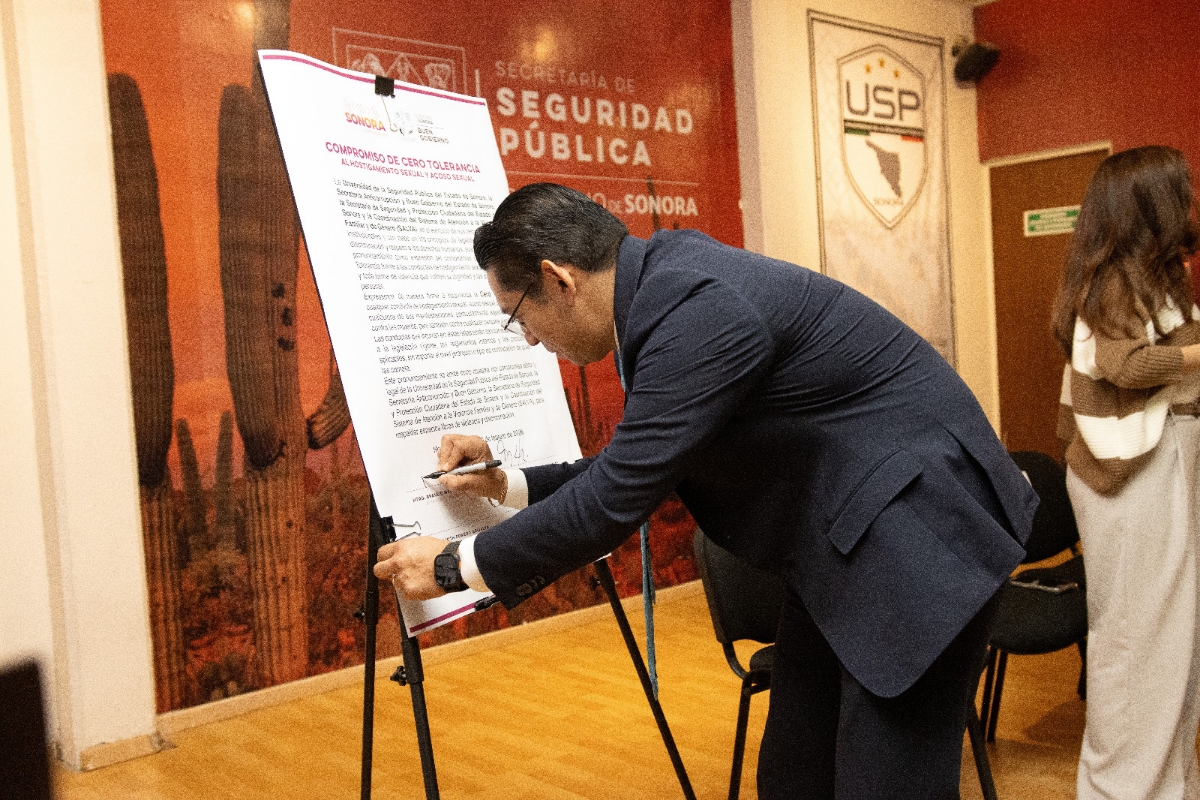 Hermosillo, Sonora; 19 de febrero de 2026.- Para refrendar el compromiso institucional para prevenir toda forma de violencia en contra de las mujeres que laboran y estudian en la Universidad de la Seguridad Pública (USP), la Secretaría de Seguridad y Protección Ciudadana (SSPC) y la Secretaría Anticorrupción y Buen Gobierno en Sonora, firmaron el acuerdo de Cero Tolerancia hacia el Hostigamiento Sexual y Acoso Sexual.