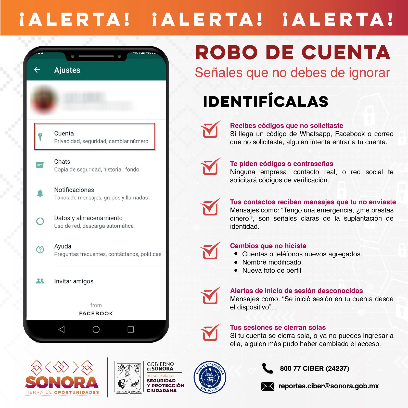 Hermosillo, Sonora; 22 de febrero de 2026.- La Secretaría de Seguridad y Protección Ciudadana (SSPC) Sonora, a través de la Unidad Cibernética, reitera el llamado sobre el riesgo de robo y suplantación de cuentas en redes sociales y aplicaciones de mensajería instantánea, una modalidad de fraude digital que puede comprometer la información personal y afectar el patrimonio de las familias.