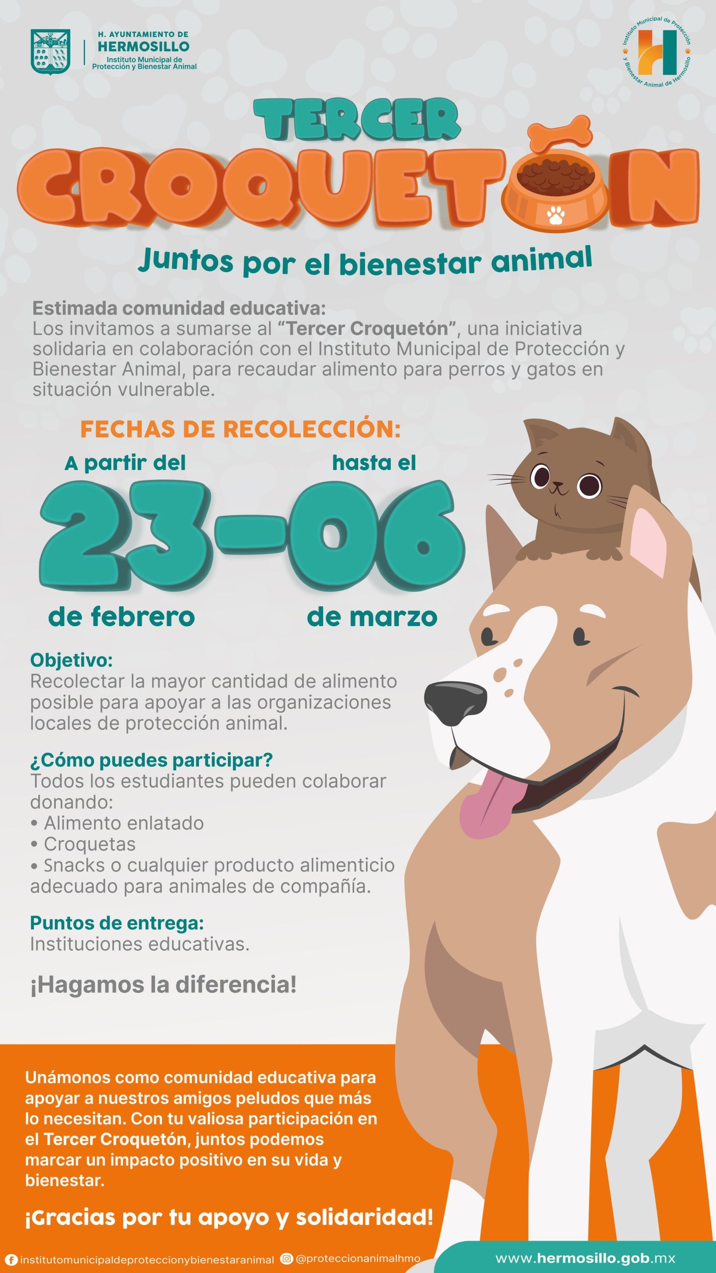 Hermosillo, Sonora; 23 de febrero, 2026.-A partir del lunes 23 hasta el viernes 6 de marzo es el periodo para participar en el Tercer Croquetón que realiza Gobierno de Hermosillo a través del Instituto Municipal de Protección y Bienestar Animal, IMPBA, informó David Palafox Celaya.