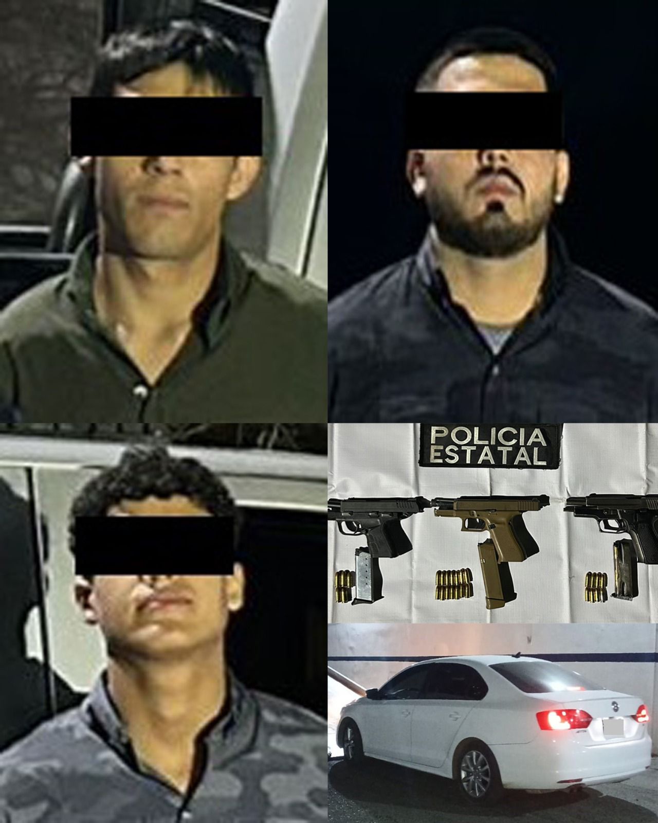 Al llegar al sitio encontraron un vehículo Jetta, Volkswagen, de color blanco, donde se encontraba una persona armada; además, del establecimiento comercial salieron otros tres sujetos que fueron detenidos por la Policía Estatal, mismos que fueron señalados por intentar privar de la libertad a una persona que se encontraba en el lugar.
