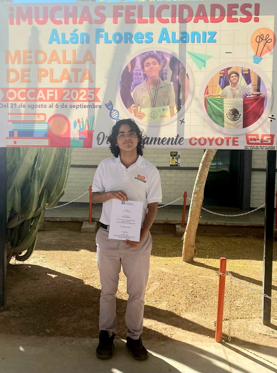 Hermosillo, Sonora; 5 de marzo de 2026.- Alan Flores Alaniz, estudiante del Colegio de Bachilleres del Estado de Sonora (Cobach), plantel Caborca, obtuvo el tercer lugar en la final del Concurso Internacional de Ciencias 2026, organizado por el Instituto Tecnológico y de Estudios Superiores de Monterrey, en la rama de Física, tras competir con más de dos mil 300 jóvenes de distintos países.