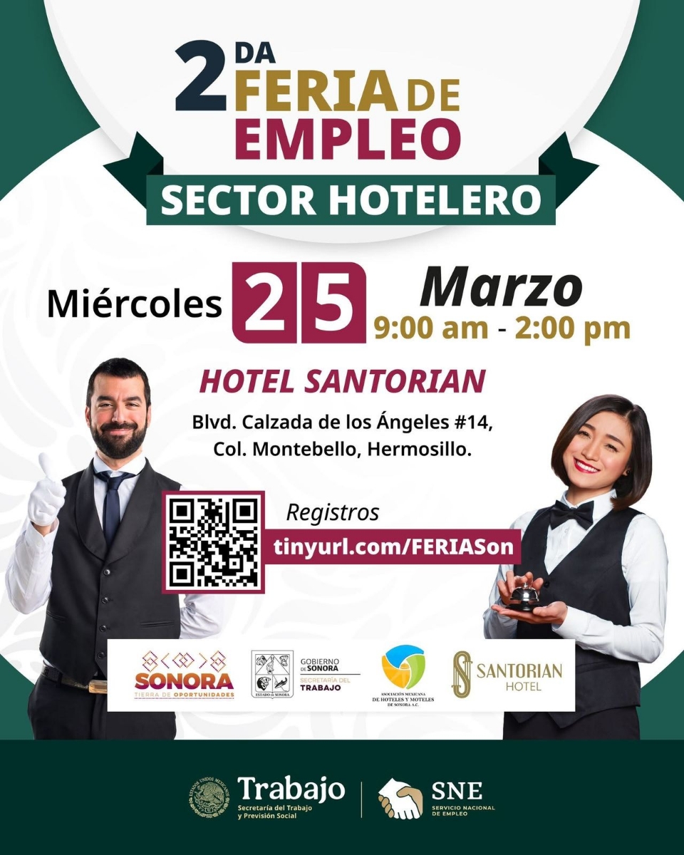 Hermosillo, Sonora; 20 de marzo de 2026.- Para fortalecer el mercado laboral con oportunidades para las y los sonorenses, el Gobierno de Sonora, mediante la Secretaría del Trabajo, el Servicio Nacional de Empleo (SNE) y la Asociación Mexicana de Hoteles y Moteles de Sonora, realizará en Hermosillo la 2da Feria de Empleo del Sector Hotelero, acercando vacantes formales y bien remuneradas a quienes buscan incorporarse o crecer en esta industria.