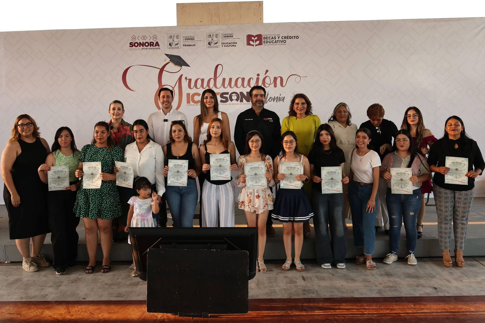 Durante la ceremonia de graduación, Paulina Ocaña, jefa de la Oficina del Ejecutivo Estatal, junto a Manuel Eduardo Gallegos Salgado, director general de ICATSON, reconoció a 395 estudiantes graduandos de Villa Bonita, Las Lomas y Los Olivos, quienes concluyeron su capacitación en 21 grupos formativos.