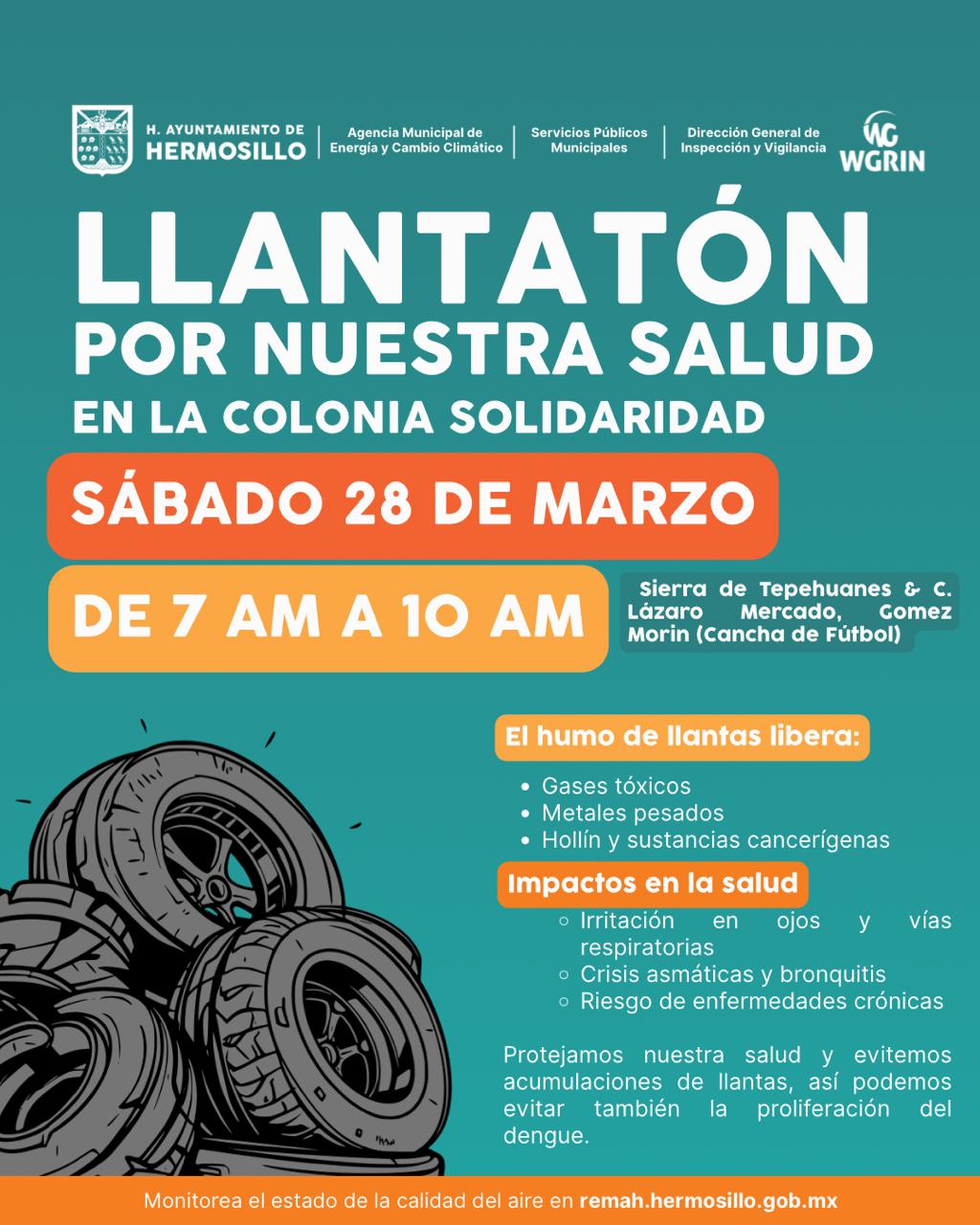 Hermosillo, Sonora; 26 de marzo, 2026.-Una nueva edición del “Llantatón por nuestra salud” organizado por el Ayuntamiento de Hermosillo a través de la Agencia Municipal de Energía y Cambio Climático, AMECC, se realizará este sábado 28 de marzo en la colonia Solidaridad.