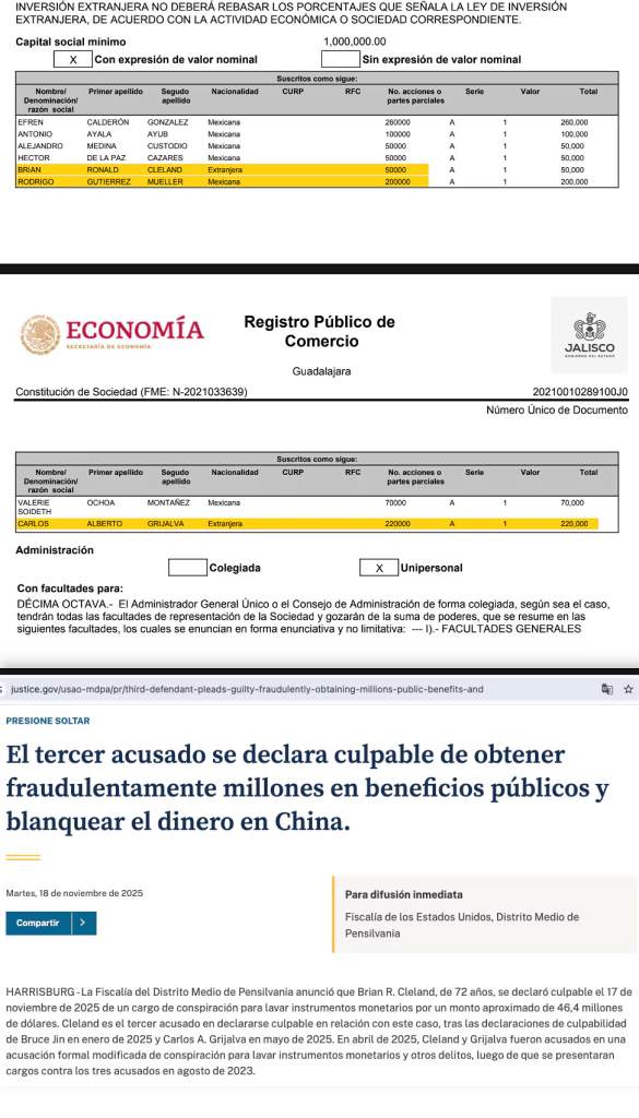 Entre los socios de las razones sociales, una registrada en la Ciudad de México y otra en Jalisco, se nombran dos personas de origen extranjero, de acuerdo con documentos del Registro Público de Comercio consultados: Carlos Alberto Grijalva y Brian Ronald Cleland.