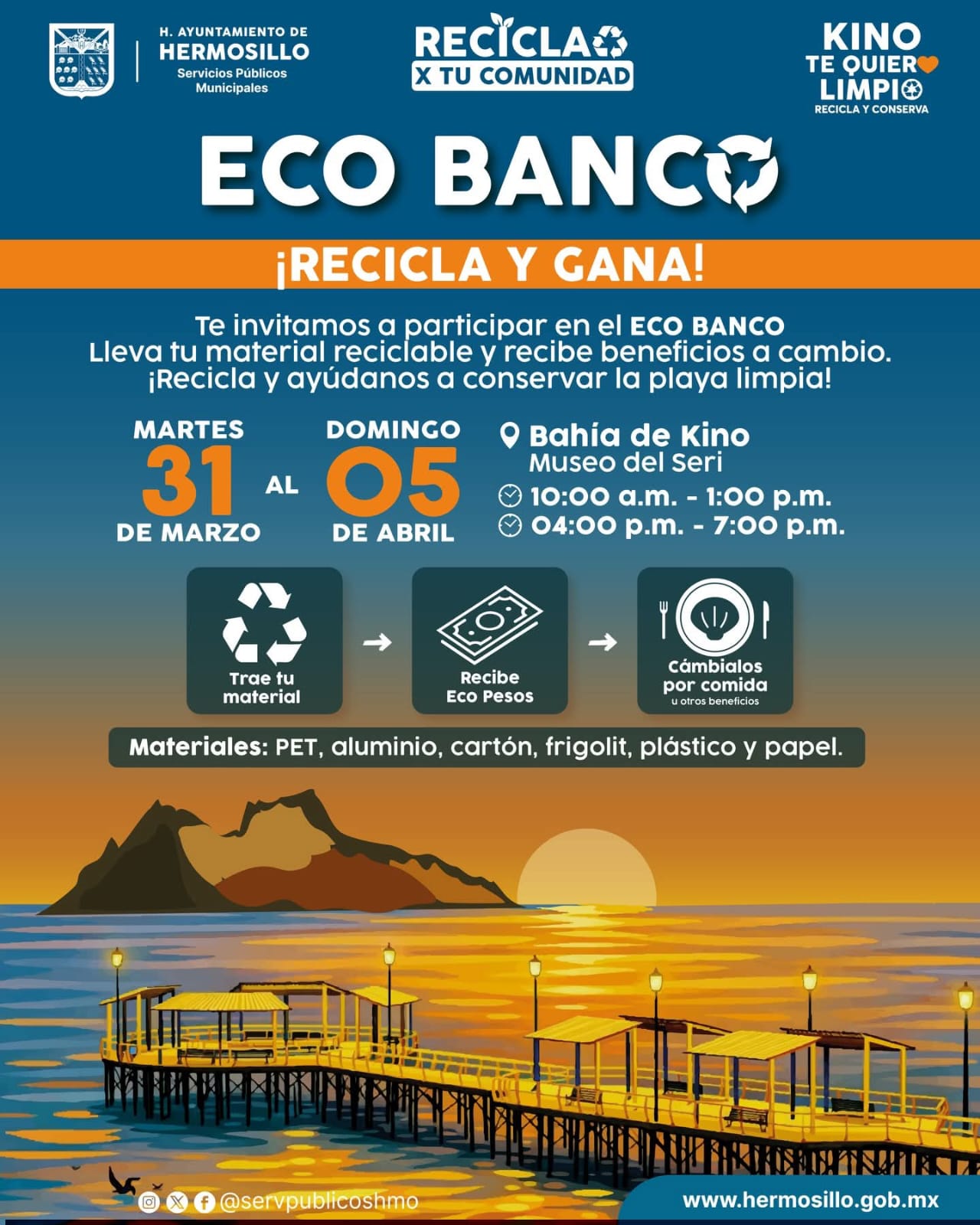 Destacó que la dependencia instaló el Eco Banco en el Museo del Seri en Bahía de Kino que estará atendiendo hasta el domingo 5 de abril en horario de 10:00 a 13:00 horas y de 16:00 a 19:00 horas para recibir el material reciclable.