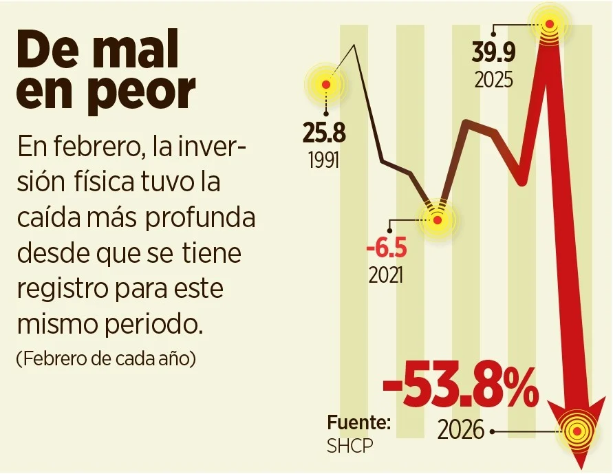 En el acumulado de enero-febrero de 2026, la inversión física presupuestaria sumó 87 mil 73 millones de pesos, cifra que representó una contracción de 45 por ciento real anual, de acuerdo con información de la Secretaría de Hacienda.
