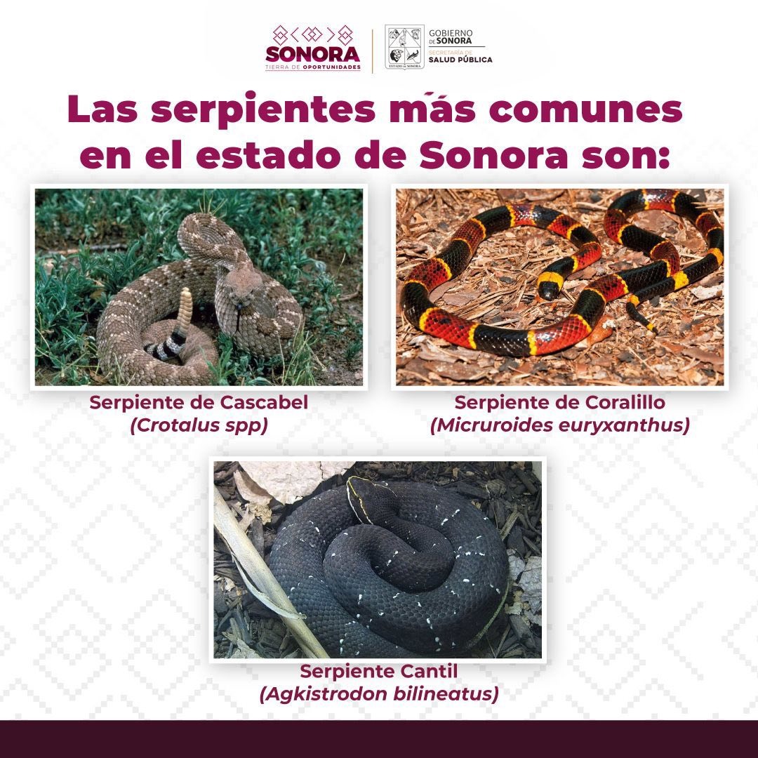 Hermosillo, Sonora; 7 de abril del 2026.- El Gobierno de Sonora, a través de la Secretaría de Salud Pública (SSP), exhorta a la población a prevenir accidentes por mordedura de serpiente y a actuar de manera oportuna ante una emergencia.