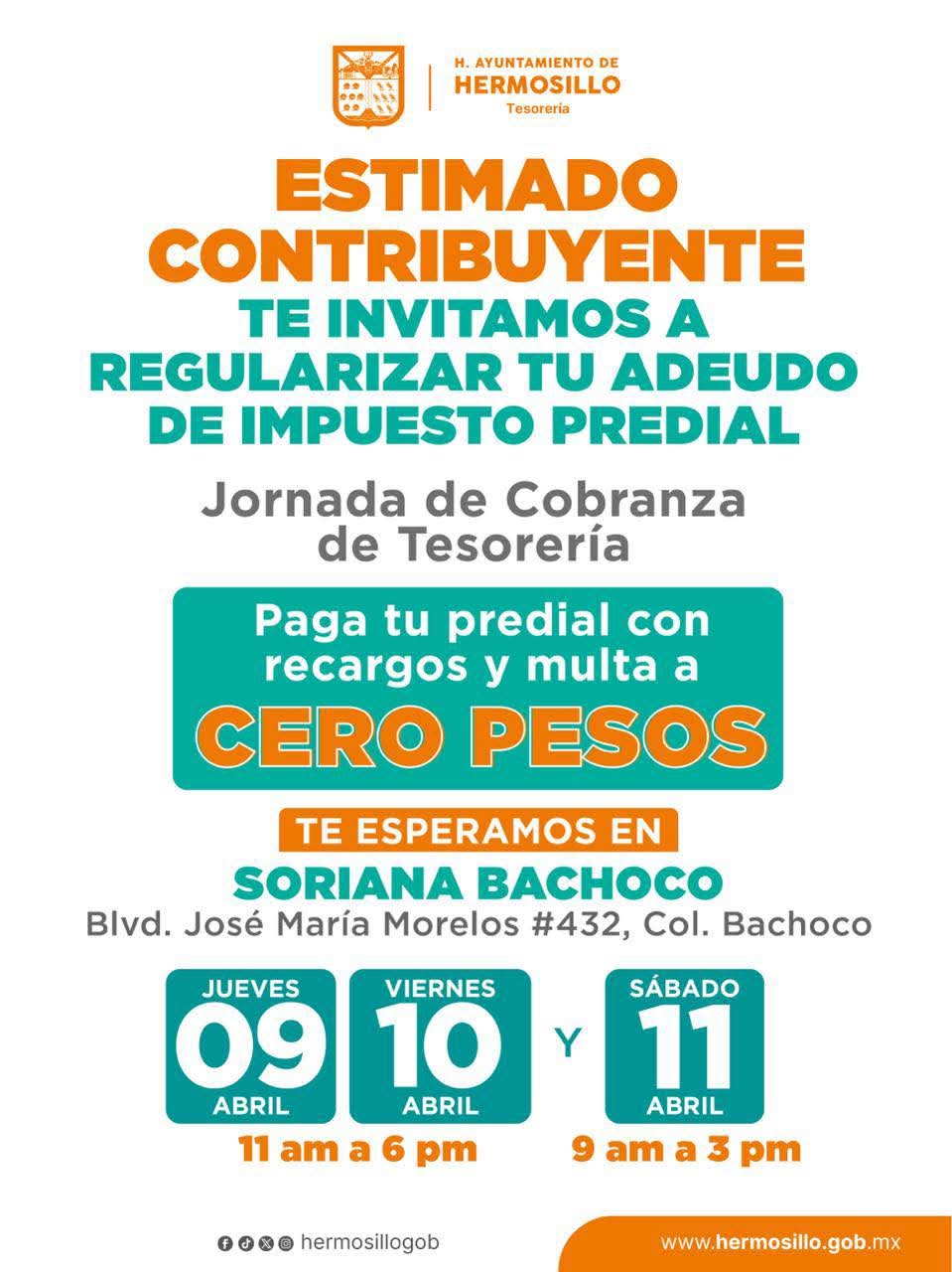 Hermosillo, Sonora; 8 de abril, 2026.- Este jueves 9, viernes 10 y sábado 11 de abril llegará Tesorería Municipal con el Programa de Regularización de Predial a centro comercial Soriana Bachoco ubicado en bulevar José María Morelos número 432, con grandes beneficios en predial como cero pesos en recargos y multa.