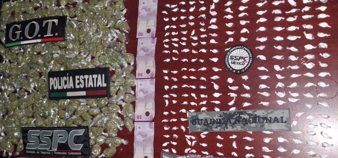 Con los protocolos de seguridad e intervención policial, le aseguraron una mochila con 283 envoltorios con hierba verde y 277 con polvo blanco, sumando un total de 560 dosis con narcótico, además de billetes con denominaciones de 50 pesos.