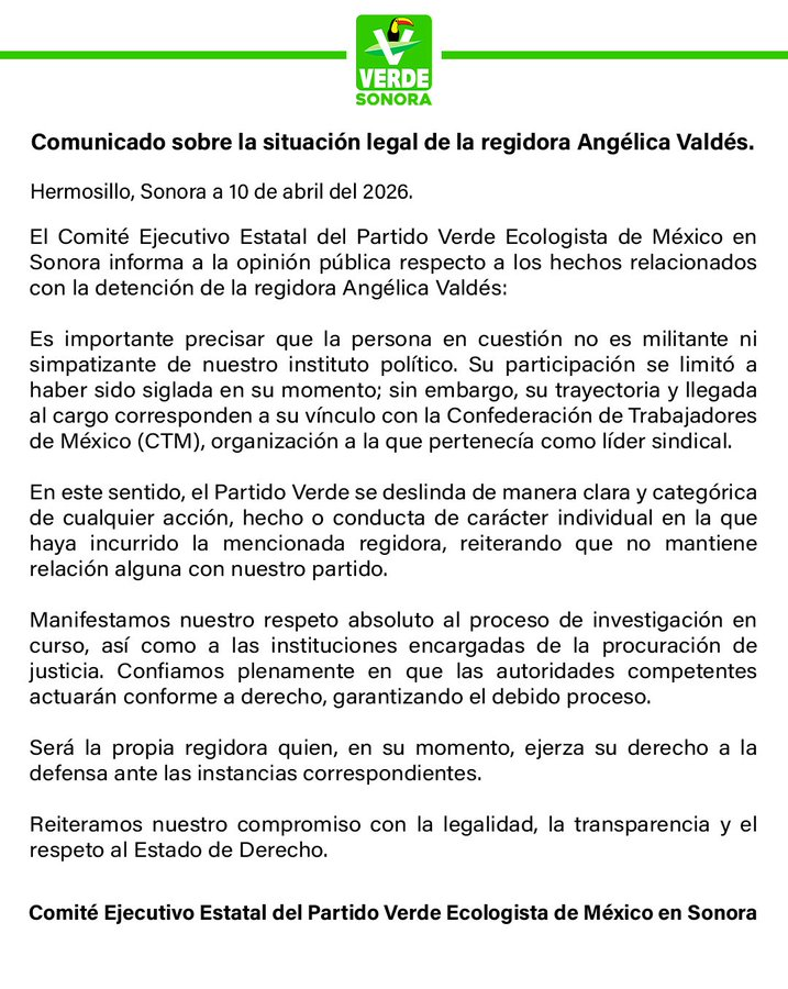 El Partido Verde Ecologista de México (PVEM) se deslindó de las acciones que pudo haber cometido la regidora de Nogales, Angélica Valdés Mendoza, quien en días pasado fue ingresada al Cereso Femenil de Hermosillo, por presunto fraude.