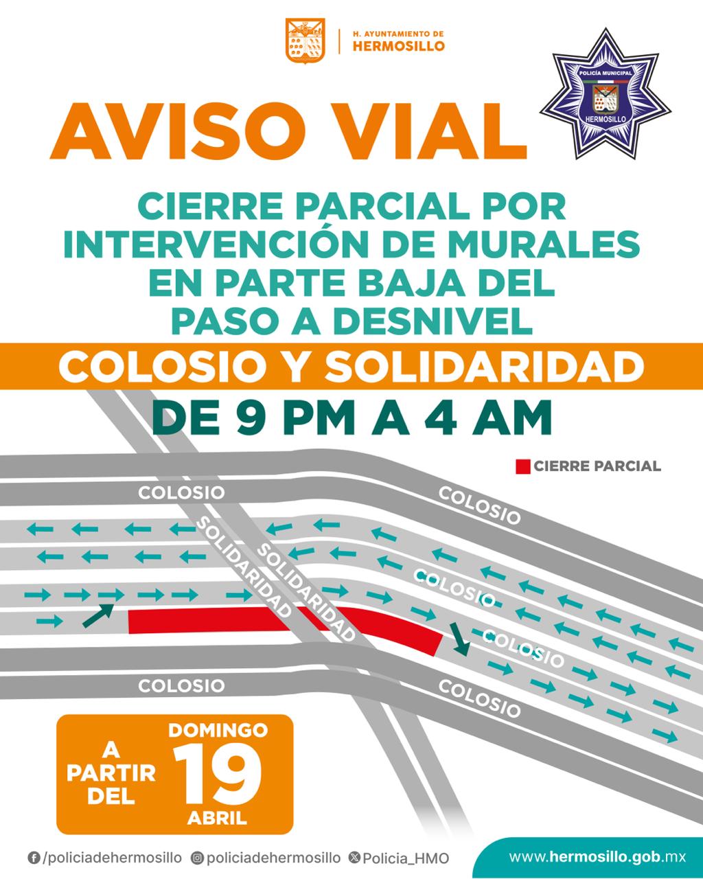 Hermosillo, Sonora, 16 de abril, 2026.- A partir de este domingo 19 de abril, el Colectivo Sangre del Desierto iniciará la intervención artística en los muros estructurales del puente del paso a desnivel de Colosio y Solidaridad en horario nocturno para no afectar el tráfico local.