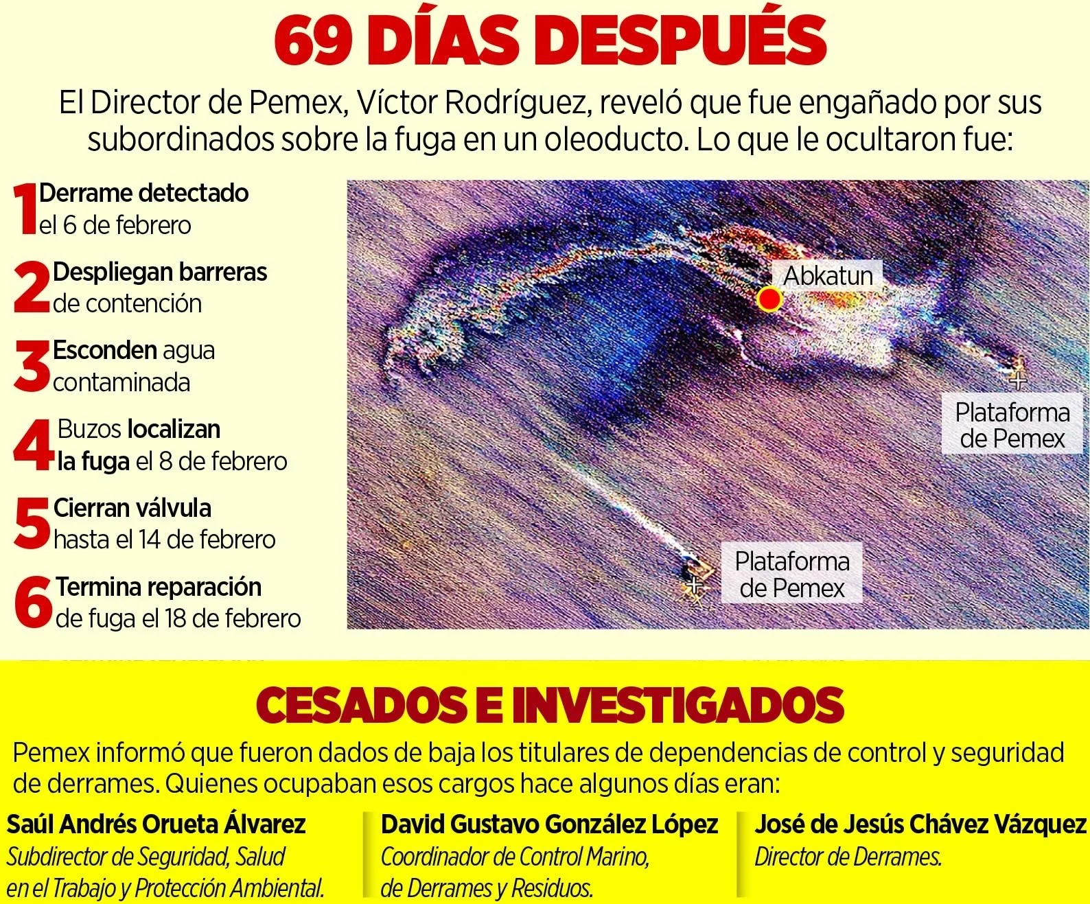 Entre las irregularidades, detalló, se encuentran el que no se le haya reportado ni a él ni a otros altos mandos de Pemex una “pérdida de integridad mecánica” en un oleoducto en la zona de Cantarell registrada a inicios de febrero y las actividades de reparación del mismo; la negación sistemática de la fuga por las áreas operativas, especialmente en marzo cuando comenzaron a llegar arribazones de petróleo a las costas del Golfo de México, y el ocultamiento de agua oleosa recuperada en las barreras de contención, de al menos 350 metros cúbicos.