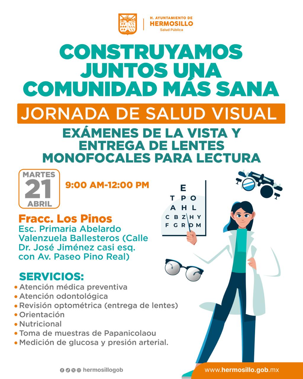 Hermosillo, Sonora; 19 de abril, 2026.- Este martes 21 de abril, las y los vecinos del sector del fraccionamiento Los Pinos podrán asistir a la Jornada de Salud Visual que realiza Gobierno de Hermosillo a través de la Dirección de Salud Municipal, informó Luis Becerra Hurtado.